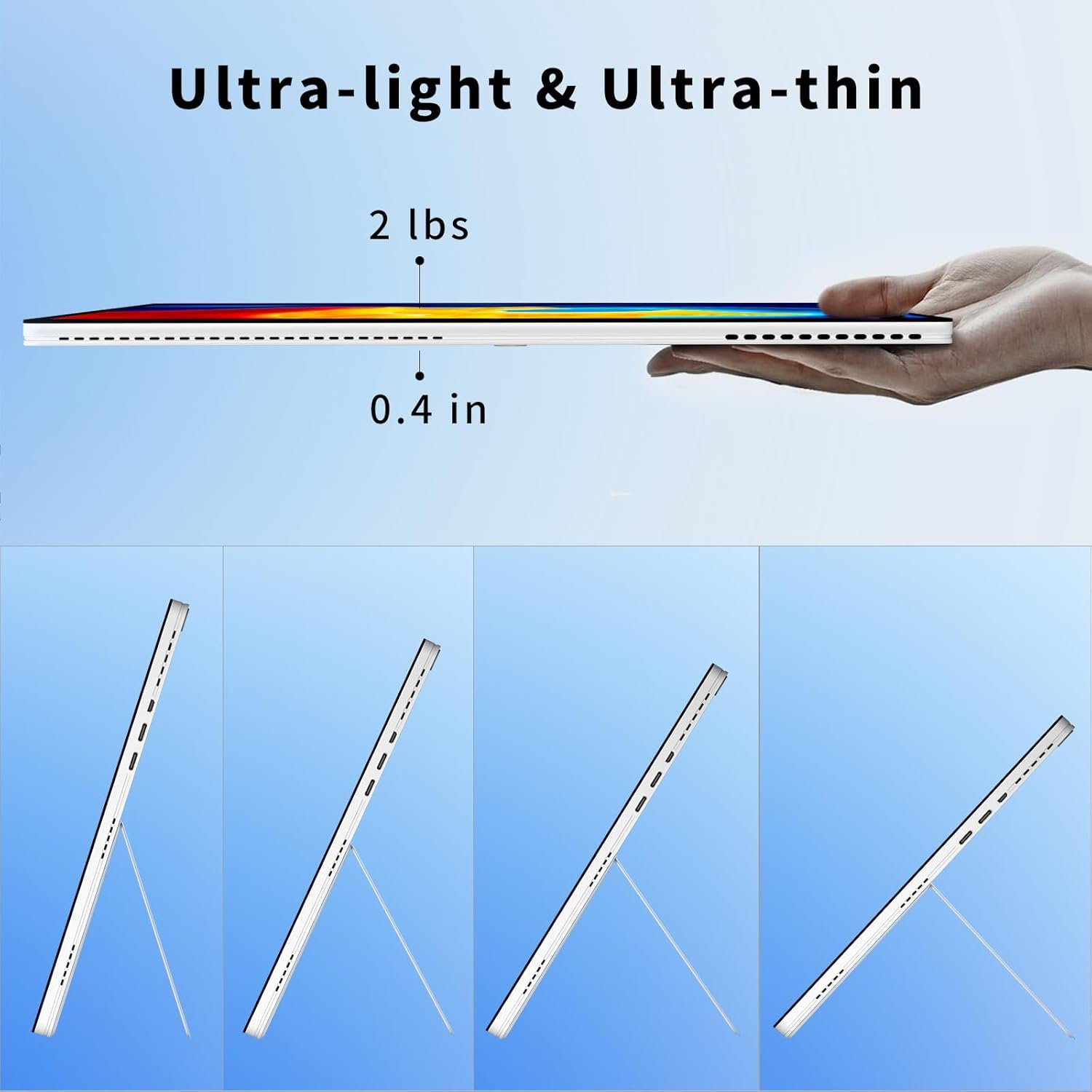Weight 2 pounds, thickness 0.4 inches. Battery life over 10 hours and can play videos for 8 hours.