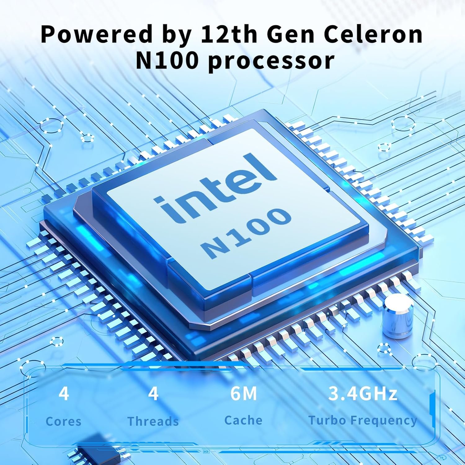 Powered by Intel 12th Gen Celeron N100 processor (up to 3.4 GHz) with 4 cores and 4 threads.